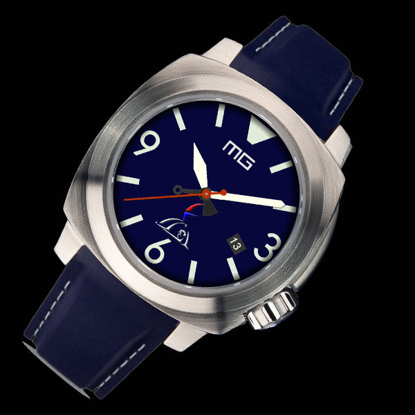 Halbschwingungen/Stunde (4 Hz), Gangreserve 40 Stunden, Stunden, Minuten, Sekunden und Datum, personalisiert von MG.