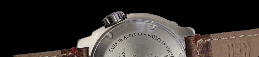 - Gehäuseboden: verschraubt, aus massivem, handgesatiniertem Edelstahl AISI 316L, graviert mit dem Wappen der Carabinieri und Personalisierung.