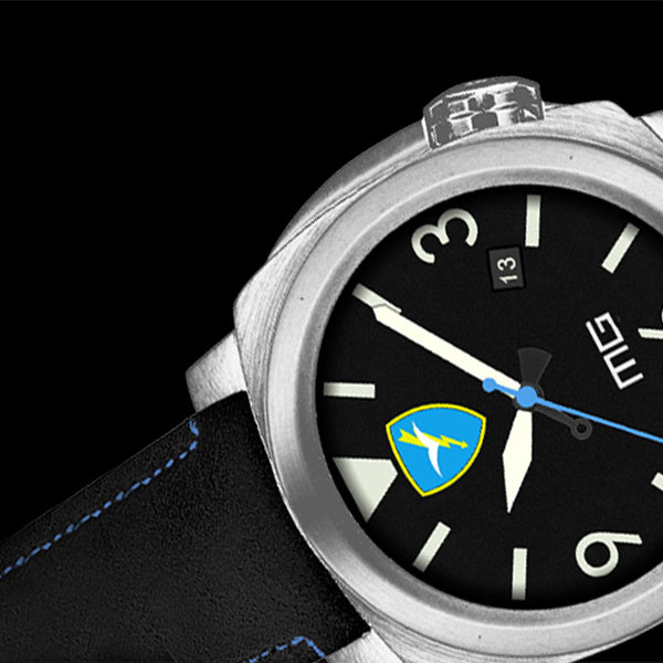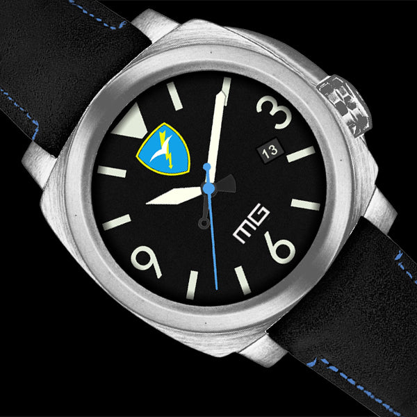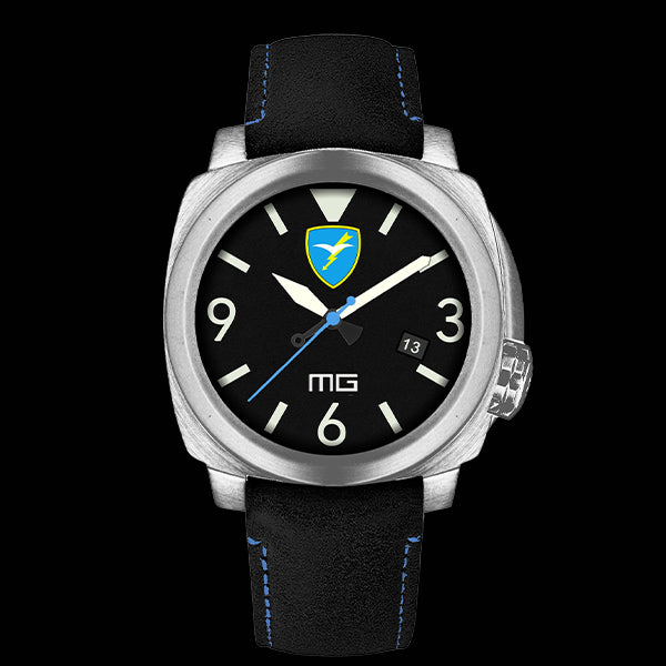 - ZIFFERBLATT aus mattschwarzer Emaille, Indizes und Zahlen aus Superluminova C1, Folgore- und MG-Logo aus Emaille.