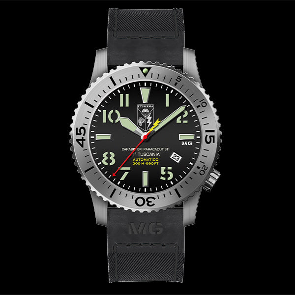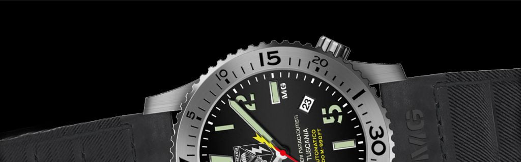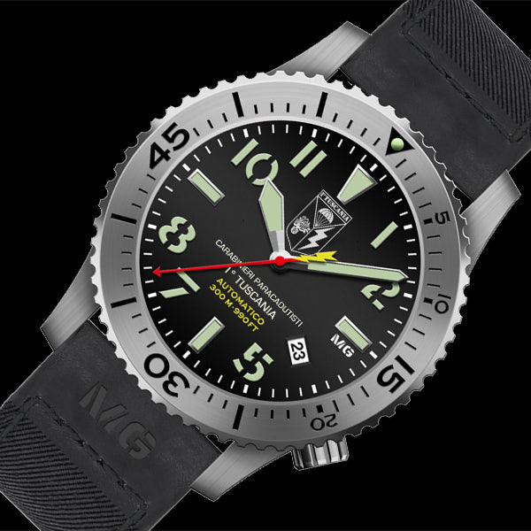 Nembo AS Tuscania ist eine Militäruhr, die für die Fallschirmjäger der Carabinieri des 1. RGT Tuscania entwickelt wurde. Eine Uhr im italienischen Design mit einer außergewöhnlichen Mechanik, um ein hochprofessionelles Produkt zu erhalten, das die Soldaten unter allen Einsatzbedingungen begleitet.