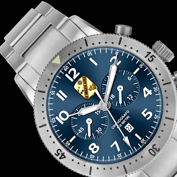 Pilot 46^ è un Orologio cronometrico al quarzo da aviatore costruito ispirandosi alla storia degli orologi militari. Un modello di pura espressione classica con un Design orgogliosamente italiano e meccanica d’eccezione, per ottenere un prodotto di eccellenza. Questo orologio nasce per accompagnare aviatori ed appassionati in ogni condizione di tempo e di luogo. Il Cronografo Pilot 46^ ha Cassa acciaio con ghiera girevole – Diametro Ø 43 mm – Una finitura spazzolata – Altezza della cassa di 11 mm. – La Corona è a vite – Anche il Fondello è a vite – Monta un Vetro minerale Sapphire coated – Garantisce una impermeabilità di 100 m. – Il Movimento al quarzo cronometrico TMI VK-64 – Il Quadrante è blu soleil con indici luminescenti bianchi – La Fibbia in acciaio – Il Cinturino acciaio spazzolato di 22mm.